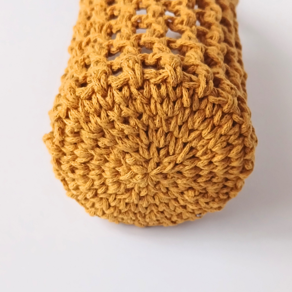 El örgüsü hardal sarısı matara kılıfı, pamuk makrome ipten üretilmiştir. Hafif ve askılı tasarımı sayesinde matarayı güvenli ve konforlu şekilde taşımanızı sağlar. Günlük kullanım, yürüyüş ve okul için idealdir. Doğal dokusu ve enerjik rengiyle hem pratik hem şık bir alternatiftir.