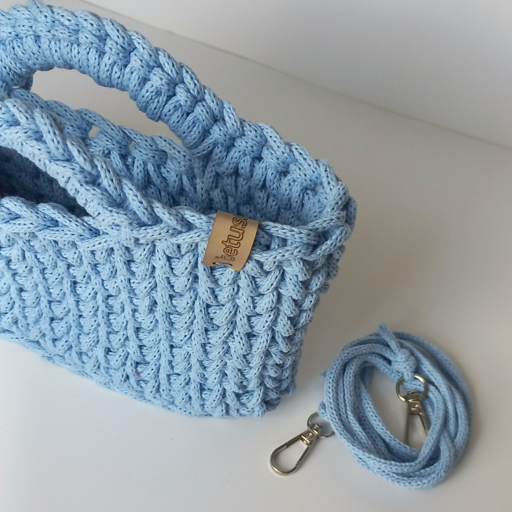 El Örgüsü Pastel Mavi Makrome Çanta – İp Askılı, Mıknatıslı Kapamalı