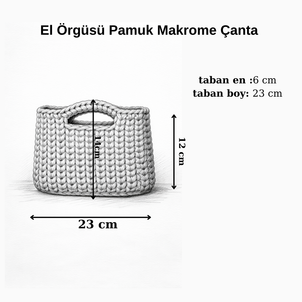 Ürün, %70 pamuk ve %30 polyester içeren pamuk makrome ip kullanılarak el emeğiyle örülmüştür. Bu sayede çanta, doğal bir doku sunar ve aynı zamanda formunu uzun süre korur. Pamuk oranının yüksek olması, yumuşak ve konforlu bir kullanım sağlar. Bununla birlikte polyester katkı, örgü yapının dayanıklılığını artırır.