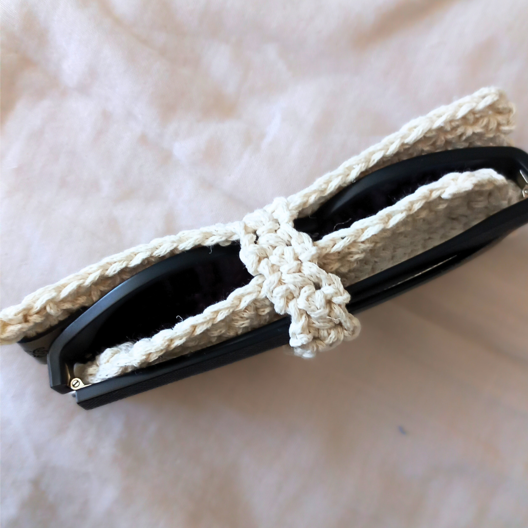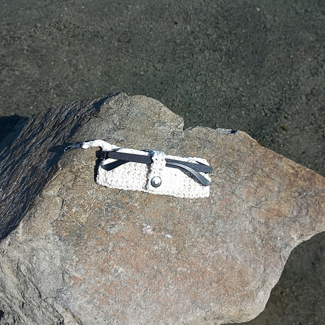 El örgüsü beyaz gözlük organizeri, 15×6 cm boyutunda üretilir ve çantanıza klips ile asılır; böylece gözlüğünüz her zaman elinizin altında olur ve çizilmelerden korunur.