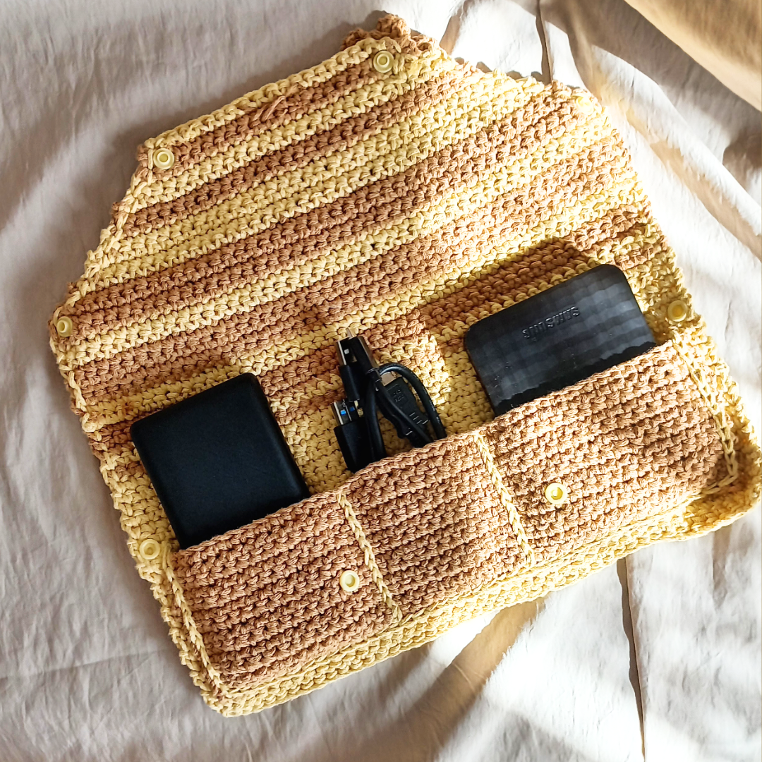 Powerbank, harddisk, şarj kablosu ve benzeri küçük teknolojik aksesuarlar artık çantada karışmıyor! Bu el örgüsü organizer, hem işlevsel hem de estetik tasarımıyla eşyalarına düzen kazandırır. Tamamen el emeğiyle örülen yapı, dayanıklılığı ve özgünlüğü bir araya getirir.