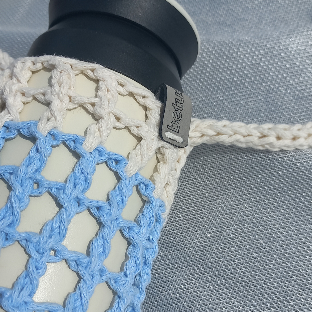 Mavi-Beyaz matara kılıfı, tamamen pamuk makrome ipten el emeğiyle üretilmiştir. Canlı ve uyumlu 5 renk bir araya getirilerek tasarlanan bu kılıf, hem işlevsel hem de dikkat çekici bir aksesuardır.