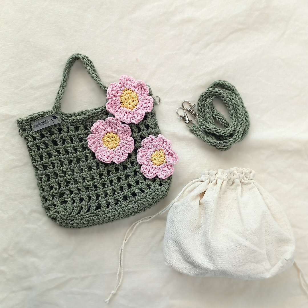 Doğal pamuk ipler kullanarak ördüğümüz Haki Çiçekli Örgü File Çanta, minimal yapısıyla hem zarafeti hem sadeliği bir araya getirir.