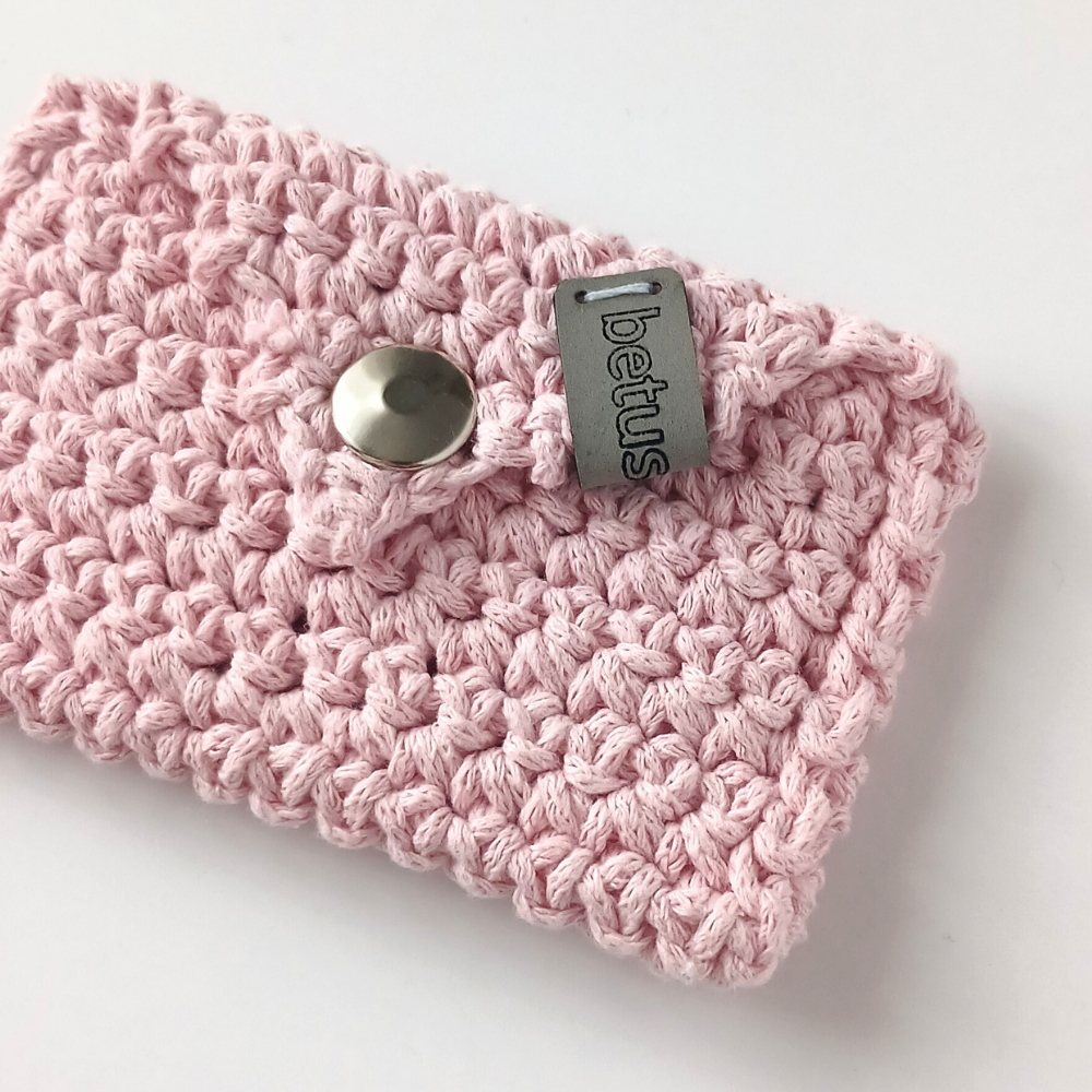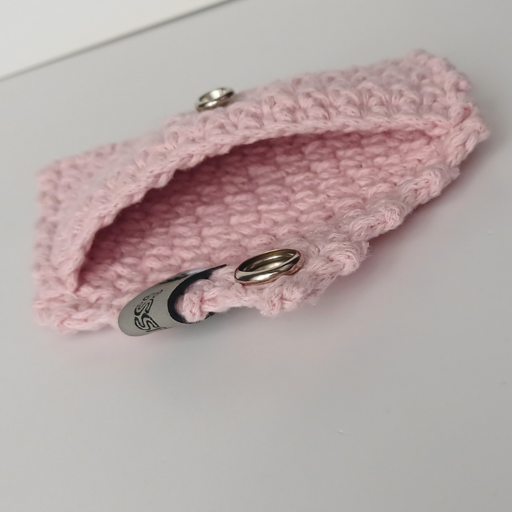 Bu kartlığı yumuşak pembe tonuyla, pamuk makrome ip kullanarak elde örüyoruz. Düğmeli tasarımı sayesinde kartlarını güvenle saklarsın. Hafif ve esnek yapısıyla çantanda ya da cebinde rahatça taşırsın. Yumuşak dokusu ciltle uyumludur; el emeğiyle örüldüğü için her biri benzersizdir. Kart, bozuk para ya da küçük notlar için sade ama kullanışlı bir çözümdür. Şıklığı ve sadeliği bir arada sunar. en : 11 cm boy : 7 cm