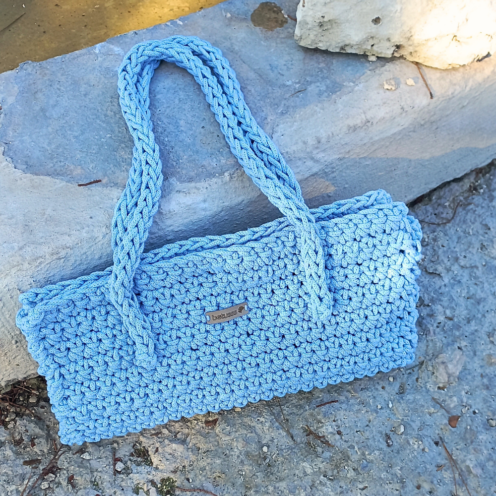 Yumuşak tonu ve modern görünümüyle öne çıkan pastel mavi baget çanta, kalın ip dokusu sayesinde tok ve formunu koruyan bir duruş sunar. El yapımı yapısı, çantaya hem karakter hem de özgünlük kazandırırken pastel mavi rengiyle ferah ve zarif bir stil yaratır.
